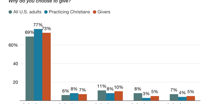 이번 연구는 지난 한 해 동안 교회를 포함한 자선단체에 돈을 기부했다고 말한 미국의 성인들을 기부자라로 정의했으며 미국 성인 중 60퍼센트, “실천하는 기독교인”의 90%가 여기 속한다고 밝혔다.