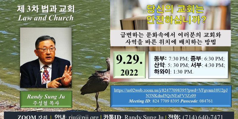 당신의 교회는 안전하십니까? 라는 주제인 이번 줌강의는 급변하고 있는 최근의 문화속에서 미주의 한인교회들이 계획하고 진행하는 다양한 사역들이 법과 사회적 상황 속에 안전하게 자리잡으며 발전해 나갈 수 있도록 지원하고자 마련된다.