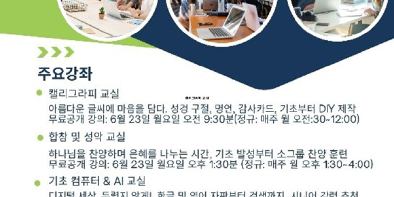 “함께 배우고 나누며, 따뜻한 커뮤니티로 여러분을 초대합니다”라는 주제로 진행되는 이번 공개강좌는 캘리그라피교실부터 생활영어교실, 함창과 성악교실, 기초 컴퓨터 및 AI교실, 건강셀프케어 교실, 등 다양하며 모든 강의는 수시 모집으로 모든 연령층을 환영하며 누구나 환영한다.  등록비 $150로 선착순 50명 이다.