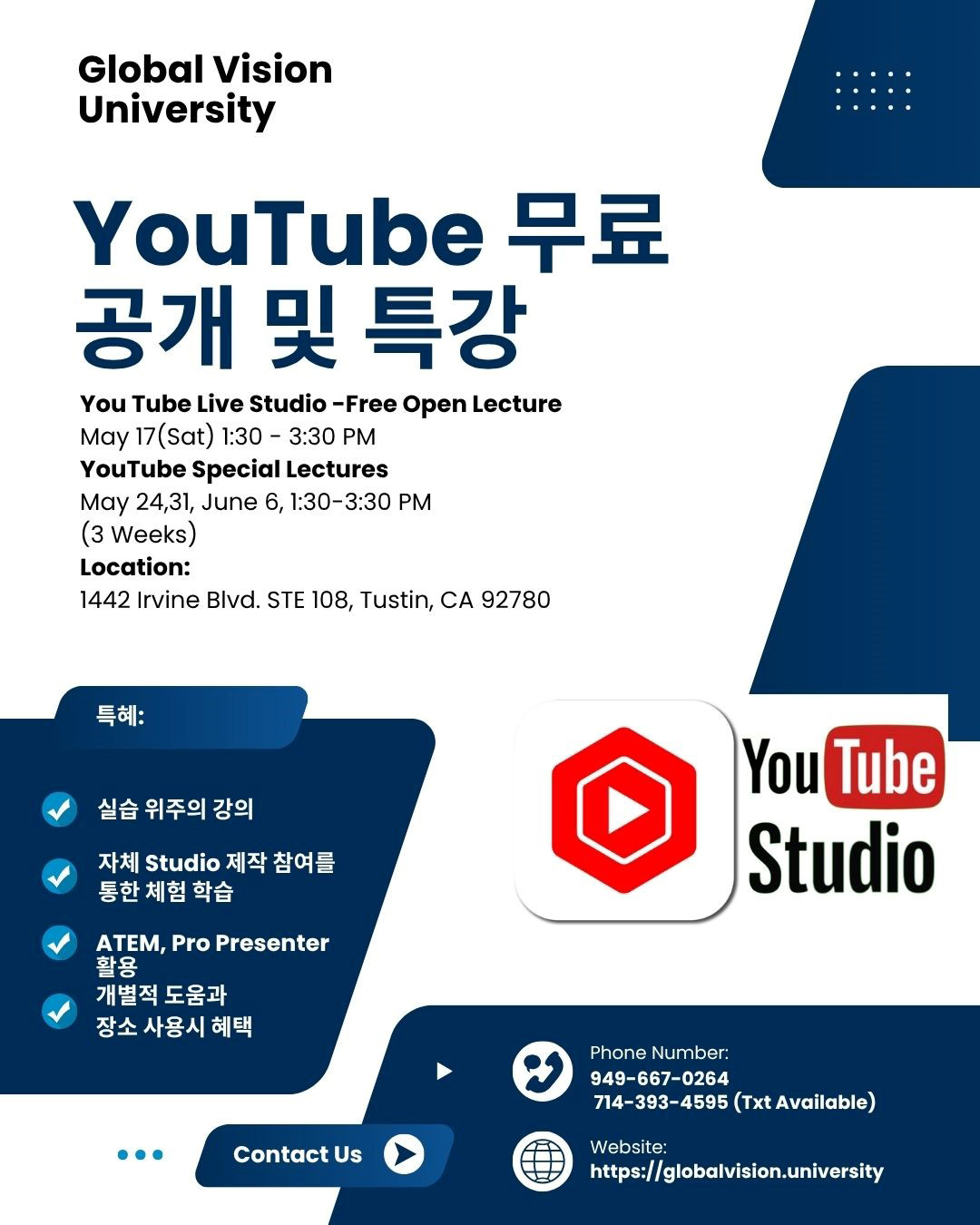 YouTube 방송 제작 강좌와 Live Studio개장을 앞두고 있는 글로벌비전대학에 지난 5월17일 토요일 무료공개 강좌에 이어 앞으로 3번의 토요일 마다 영상제작 및 라이브방상 공개강좌를 시작한다.