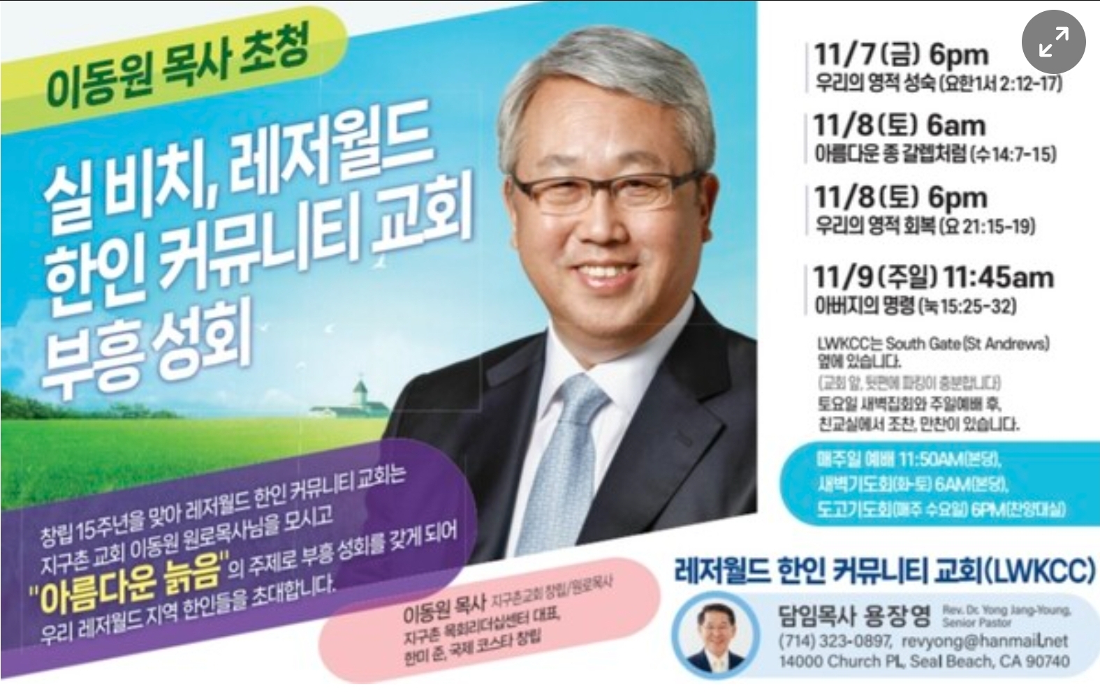 이목사는 국제 코스타 창립자며 지구촌 목회리더십센터 대표로 이번 성회를 통해 이민 사회, 특히 레저월드 지역 은퇴 이민자들의 영적 회복과 성장에 초점을 맞춘 메시지를 전한다.