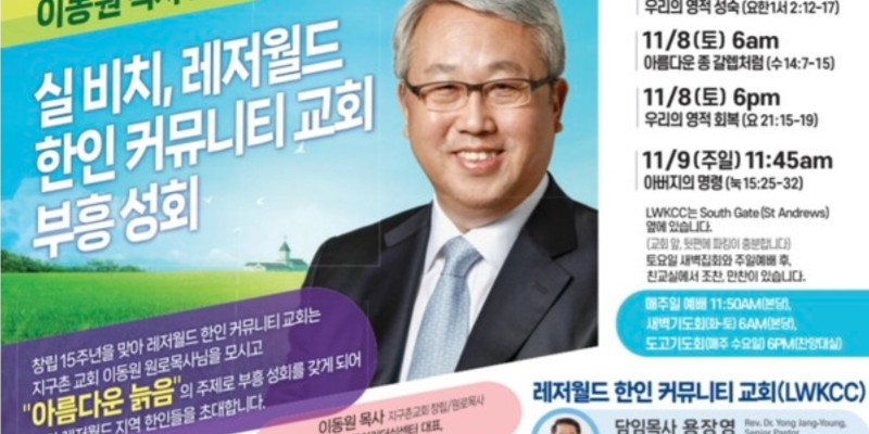 지구촌교회 창립 및 원로목사로 한국 교회에 깊은 영적 영향력을 끼쳐온 이동원 목사가 실비치 소재 레저월드 한인 커뮤니티 교회(LWKCC, 담임 용장영 목사)창립 15주년 기념 부흥성회 강사로 초청, 3일간 말씀을 선포한다.