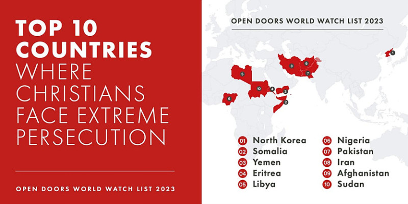 기독교 박해가 가장 심각한 11국가는 북한, 소말리아, 예멘, 에리트레아, 리비아, 나이지리아, 파키스탄, 이란, 아프가니스탄, 수단, 인도 순이다.