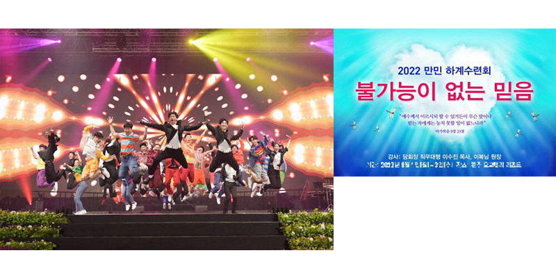 IYF월드캠프에서 열린 댄스 공연 장면 (왼쪽사진, 출처 IYF 홈페이지), 2022 만민 하계수련회 포스터 (출처 만민중앙교회 홈페이지)