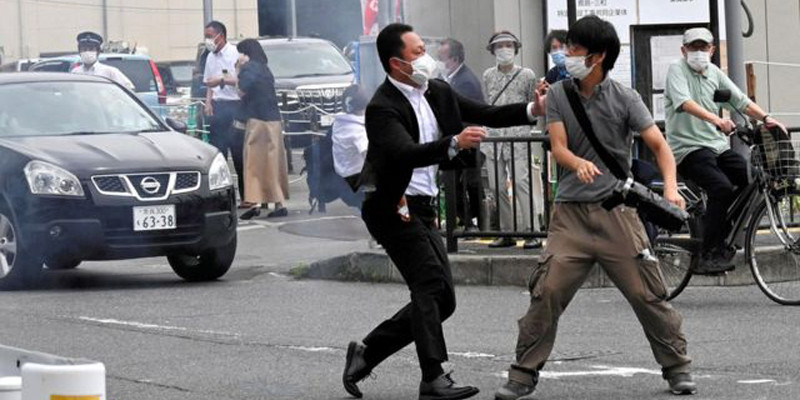 아베 신조 전 총리를 살해한 야마가미 데쓰야(오른쪽) 현장에서 체포되고 있다. 유튜브 동영상 캡처.