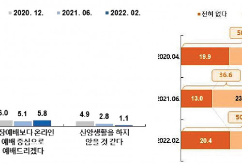 코로나19 기간 중 신앙생활 변화 (왼쪽 그래프), 온라인 교회 참여의사 연별 변화도. 코로나19는 교회에 많은 변화를 가져왔다. 온라인 예배가 활성화되는 등 대면 모임 제한으로 교회 공동체 형태도 달라졌다. 특히 이러한 변화는 개인의 신앙생활에도 영향을 미쳤다는 분석이 나왔다.코로나19로 인한 한국교회의 예배와 신앙생활의 변화를 알아보는 조사 결과가 발표됐다. 한국기독교사회문제연구원이 개신교인 1,000명을 대상으로 설문조사를 실시한 결과, 시간이 지날수록 온라인 예배에 대한 만족도는 증가했고, 대면 예배를 다시 확대하는 시점엔 온라인 예배에 대한 선호도가 감소했다. 어쩔 수 없이 온라인 예배를 드리면서 괜찮다고는 느꼈지만 여전히 대면 예배를 더 선호한다는 뜻이다.또 대면 예배의 회복으로 개인의 신앙성숙에 어려움을 느꼈던 응답자의 비율이 7%가량 떨어져 대면 예배 참석 기능과 신앙성숙에 비례 관계를 보였다.반면 온라인 예배를 중심으로 가끔 대면하는 형태의 교회에 참여할 의향이 있느냐는 질문에는 참석하겠다는 응답이 평균 40%를 유지해 향후 온라인 교회 출현 가능성은 상당히 높은 것으로 분석됐다.성결대학교 이민형 박사는 “온라인 예배의 불만족의 이유가 ‘내가 예배에 집중할 수 없다’, 즉 신앙생활에 조금 더 연관이 되어 있다면, 만족의 이유는 자신의 편의성과 편리성에 조금 더 초점이 맞춰져 있다고 볼 수 있다”며 “이 결과를 통해 온라인 예배는 과연 예배에 참여하게 만드는 것인가, 참여를 높이기 위한 실용 주의적인 방편으로 이해가 되고 있는 것인가에 대한 고민은 필요하다”고 말했다.신앙생활에서 코로나19 이전보다 중요해진 것으로는 ‘기도’가 58.7%로 가장 높았다. 하지만 코로나19 이전 대비 개인 기도 변화는 전체적으로 줄어 상반된 결과를 보였다.성공회대학교 정경일 박사는 “코로나19 영향으로 홀로 있는 시간이 많아졌기 때문에 기도 시간이 늘어나지 않았을까라고 생각하는 예상과는 다른 결과”라며 “예배의 참석 빈도가 높을수록 기도 시간이 늘어났다”고 설명했다.그러면서 “이는 재난 상황에서 공동체적 예배와 개인의 신앙 생활이 연결되어 있다고 볼 수 있다”고 덧붙였다.한국샬렘영성훈련원 이진권 목사는 신앙회복을 위해선 교회가 성도들이 일상 가운데 영성생활을 지속할 수 있도록 독려하는 노력들이 필요하다고 강조했다.이 목사는 “근본적인 기독교 전통에 대한 반성과 신앙의 쇄신을 한 결과가 사실 수도원 운동이고, 새로운 다양한 형태의 기도 운동이었다”며 “그런 것들을 우리가 오늘날 새롭게 재해석해서 한국교회가 적극적으로 수용할 필요가 있다고 본다”고 밝혔다.데일리굿뉴스(사장 김명전, www.goodnews1.com)와의 협약을 통해 한국 기독교 소식을 제공합니다.