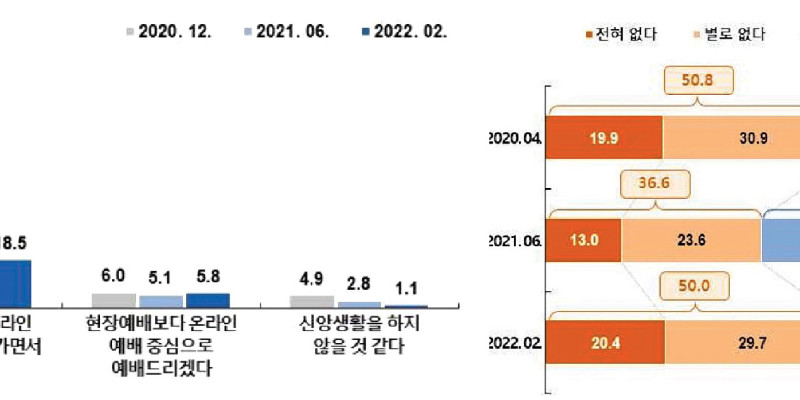 또 대면 예배의 회복으로 개인의 신앙성숙에 어려움을 느꼈던 응답자의 비율이 7%가량 떨어져 대면 예배 참석 기능과 신앙성숙에 비례 관계를 보였다.