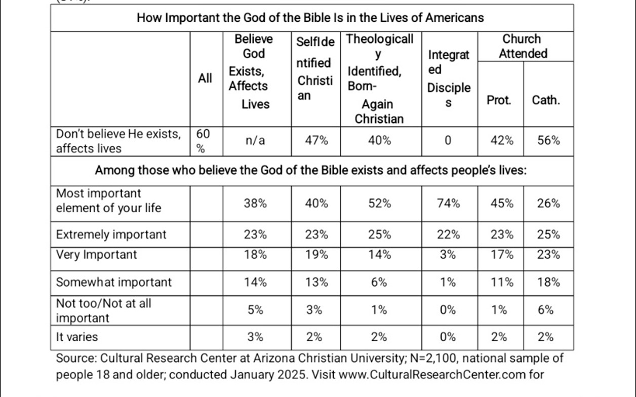 대부분의 미국인들은 성경에 나오는 하나님의 존재나 영향력을 믿지 않고 있으며 현재 40%만이 그분이 존재하시며 인간의 삶에 영향을 미친다고 믿고 있다.  구체적 보고서에 의하면 10명 중 약 8명(79%)은 성경의 하나님이 자신의 삶에서 가장 중요한 요소이거나, 극도로 또는 매우 중요한 요소라고 답했다.