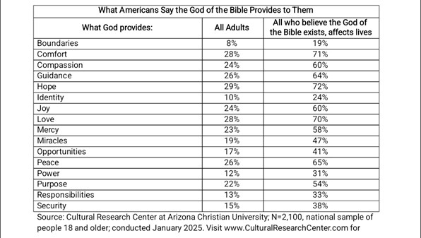 하나님이 자신에게 무엇을 주었다고 믿는지 물었을 때, 하나님을 믿는 응답자 대부분은 그 분을 희망(72%), 위로(71%), 평화(65%), 인도(64%), 연민(60%), 기쁨(60%), 자비(58%), 목적(54%)의 근원으로 꼽았다. 적은 수의 응답자들이 하나님을 기적(47%), 기회(41%), 안전(38%), 책임(33%), 힘(31%)의 근원으로 꼽았다. 하나님을 믿는 응답자 중 하나님이 정체성(24%)과 경계(19%)를 제공한다고 생각하는 비율은 4분의 1도 되지 않다.